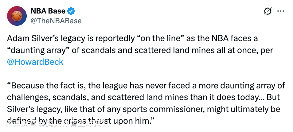 北京时间2月19日,据美记霍华德-贝克报道,随着NBA同时面临“一系列令人望而生畏的丑闻和潜在雷区”,萧华的声誉正“岌岌可危”。