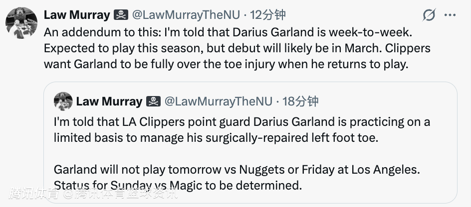 随后Murray又补充表示,加兰的伤情为每周评估一次。他预计会在本赛季复出,但首秀很可能要到3月。快船希望加兰在回归赛场时,脚趾伤势已完全康复。