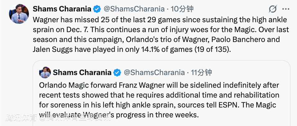 北京时间2月19日,据名记Shams报道,奥兰多魔术队前锋小瓦格纳将因左高位踝关节扭伤的酸痛问题无限期休战,近期检查显示他需要更多时间进行康复,魔术队将在三周后评估小瓦格纳的恢复进展。