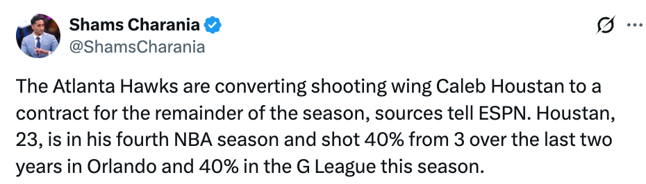 北京时间2月19日,据名记Shams报道,亚特兰大老鹰将把休斯坦的合同转为本赛季剩余时间的正式合同。随后据美记Scotto报道,老鹰计划裁掉久里西奇,以腾出阵容名额,来为休斯坦提供一份标准合同。