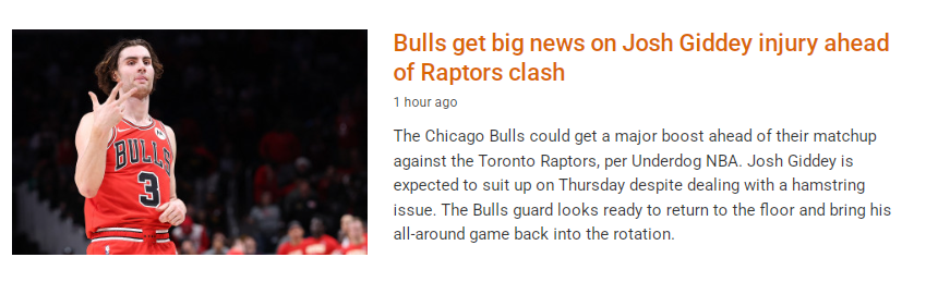 北京时间2月19日,据芝加哥体育网记者K.C. Johnson报道,公牛后卫约什-吉迪因左腿筋拉伤自1月29日起缺阵8场比赛,但他已参加完整训练,预计对阵猛龙时将复出。