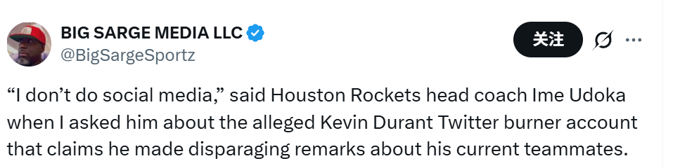 火箭主帅乌度卡被问及此事,回应道:“我不玩社交媒体。”