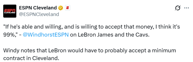 北京时间2月19日,ESPN名记文霍斯特在最新的播客节目中谈到了詹姆斯休赛期重回克利夫兰的可能性。他t表示,如果詹姆斯想要回到骑士,就可能得接受一份老将底薪。他说道:“如果詹姆斯愿意并且能够接受一份底薪合同,那么他重返克利夫兰骑士的可能性将高达99%。”