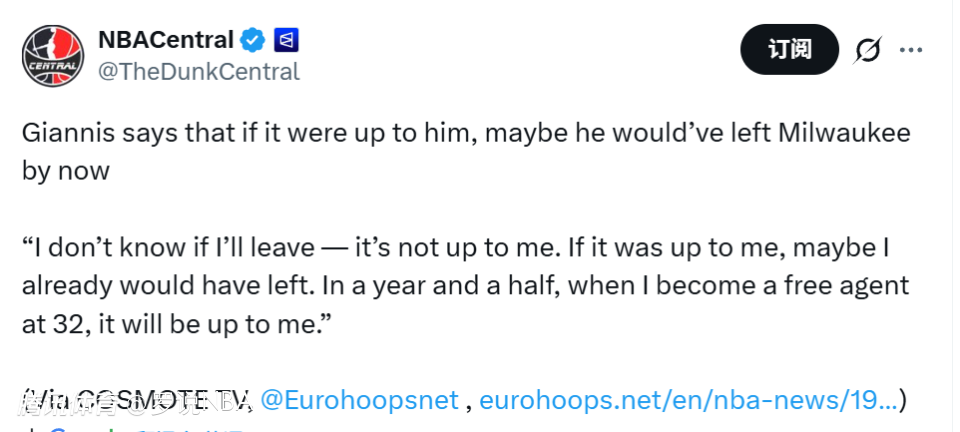 当记者问他是否有可能离开密尔沃基时,字母哥回应道:“就像美国人常说的,看法不值钱——所以谁都能有。此时此刻,我就在密尔沃基。”