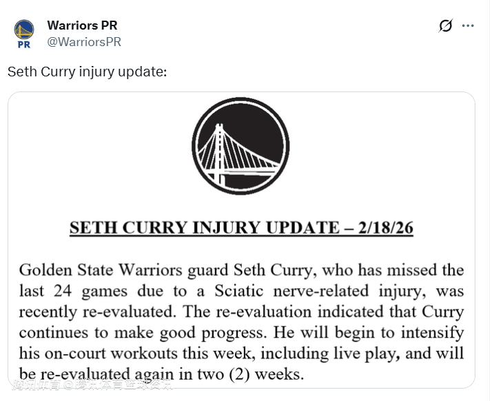 北京时间2月19日,勇士官方更新伤情公告,宣布球队后卫塞斯-库里因坐骨神经相关伤势已缺阵过去24场比赛,近日接受复查,结果显示恢复进展良好。他将于本周加强场上训练,包括对抗练习,并在两周后再次接受复查。