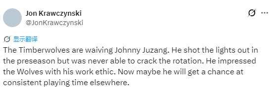 朱赞是近期达到50场常规赛限制的双向合同球员之一,森林狼本需将他提拔至15人正式阵容才能继续让他出战。相反,球队选择裁掉他,让他能在3月5日双向合同签约截止日前加盟其他球队。