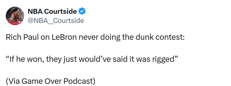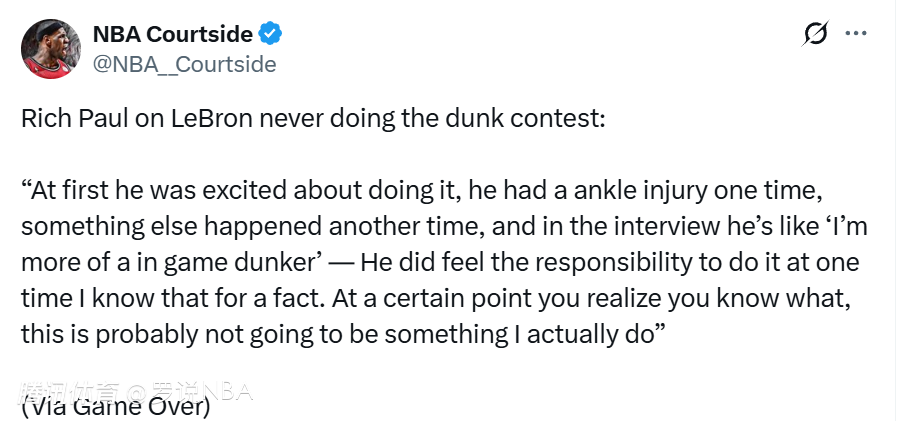 里奇-保罗在自己的《Game Over》播客节目中大胆断言,如果詹姆斯当年真的参加并赢下扣篮大赛,外界会是什么反应。“如果他赢了,人们只会说比赛是暗箱操作的。”保罗说道。