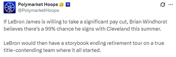 Tim MacMahon报道称,联盟中盛传,詹姆斯今夏可能重返克利夫兰,开启一场史诗级的退役巡演。