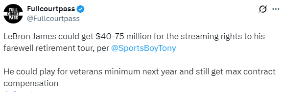 詹姆斯的未来备受关注,据美记者Anthony Lima报道,与媒体界的几位高管谈了谈,在流媒体转播权竞标大战中,据说,詹姆斯退役巡演赛季的版权能卖4000万美元至7500万美元,即使下赛季詹姆斯接受老将底薪合同加盟一支争冠球队,他也能通过场外获得堪比甚至超过顶薪合同的经济补偿。