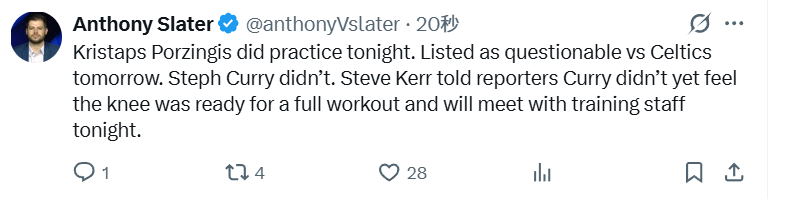 北京时间2月19日,NBA常规赛继续进行,勇士明日对阵凯尔特人。据勇士队记Anthony Slater报道,新援波尔津吉斯已参加了训练,被列入明日对阵凯尔特人的比赛出战成疑名单。库里没有参加训练。