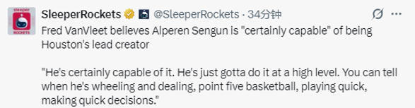 北京时间2月19日,火箭队球员范弗利特在播客节目中表示,申京完全有能力成为火箭队的头号进攻发起点。