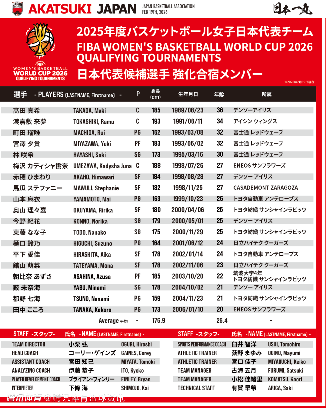 北京时间2月19日,日本篮协公布了日本女篮世预赛的集训名单,此前在亚洲杯有着出色发挥的田中心入选,她也是本次日本女篮集训队最年轻的球员(20岁),本次日本女篮集训队,平均身高为176.9cm,平均年龄为26.4岁。