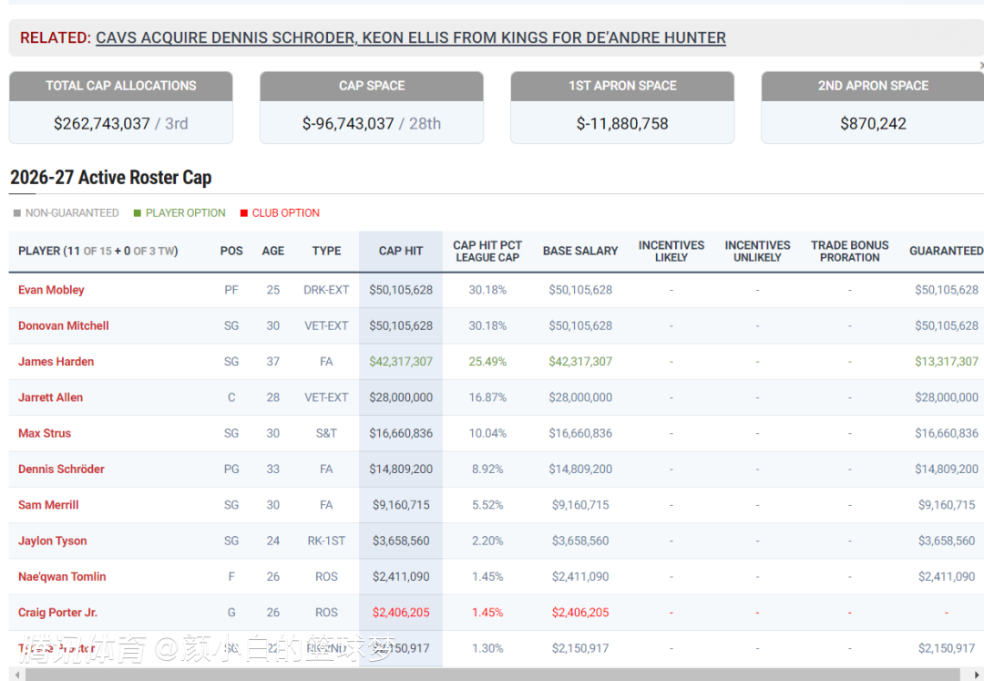 而且根据CBS的报道,詹姆斯重返骑士队有三种方式,第一种就是最简单的底薪加盟,骑士队2026年有28顺位签,骑士队下赛季保障名额就是12人,预计骑士将超过第二土豪线200万(还没算续约埃利斯;)