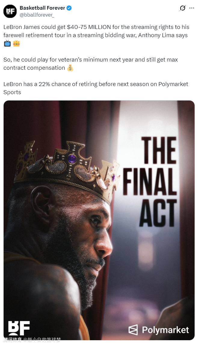根据BF的报道,詹姆斯的退役巡演流媒体播放版权可能会卖到4000万至7500万美元,所以就算詹姆斯以老将底薪重返骑士,那么他仍然能获得比肩顶薪的待遇。