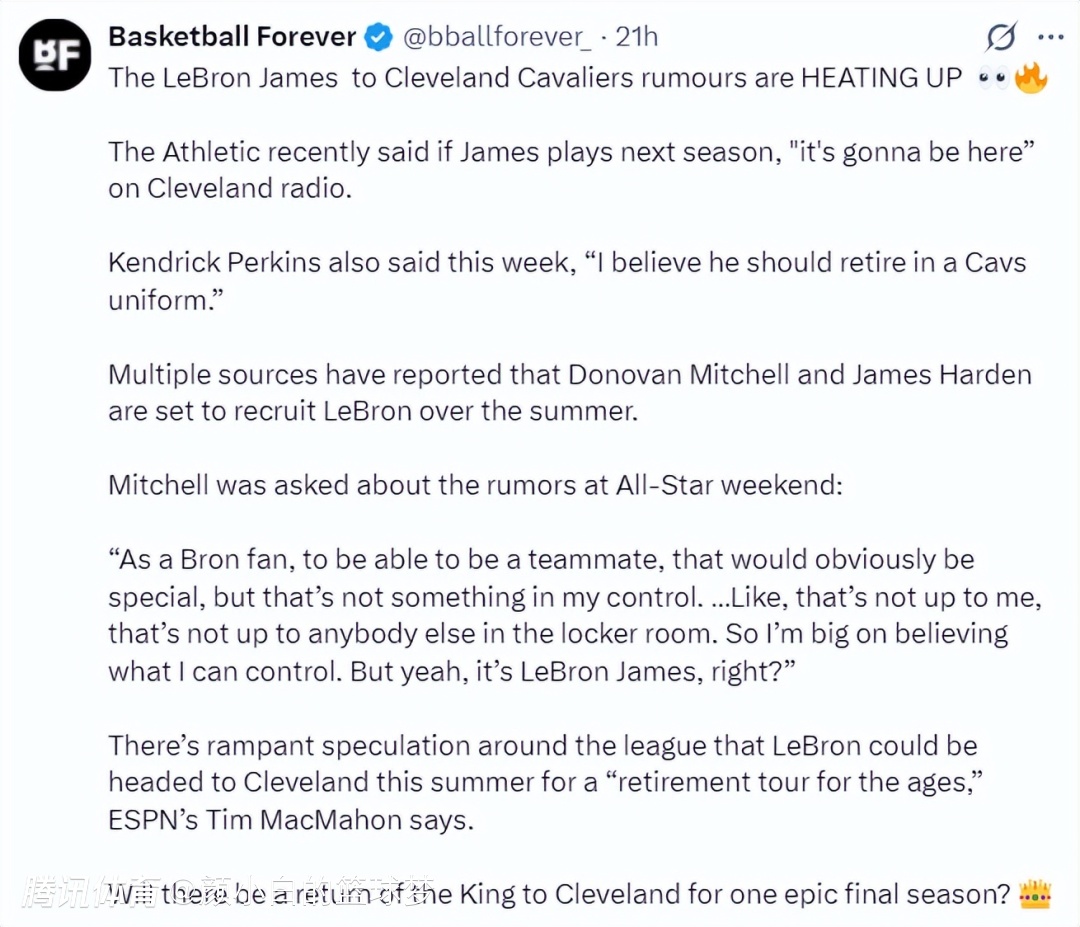 美媒TA也认为下赛季詹姆斯一定会重返克利夫兰,米切尔、哈登也会在今夏招募詹姆斯,美记蒂姆-麦克马洪透露詹姆斯今夏可能重返克利夫兰开启一场‘史无前例的退役巡演’。