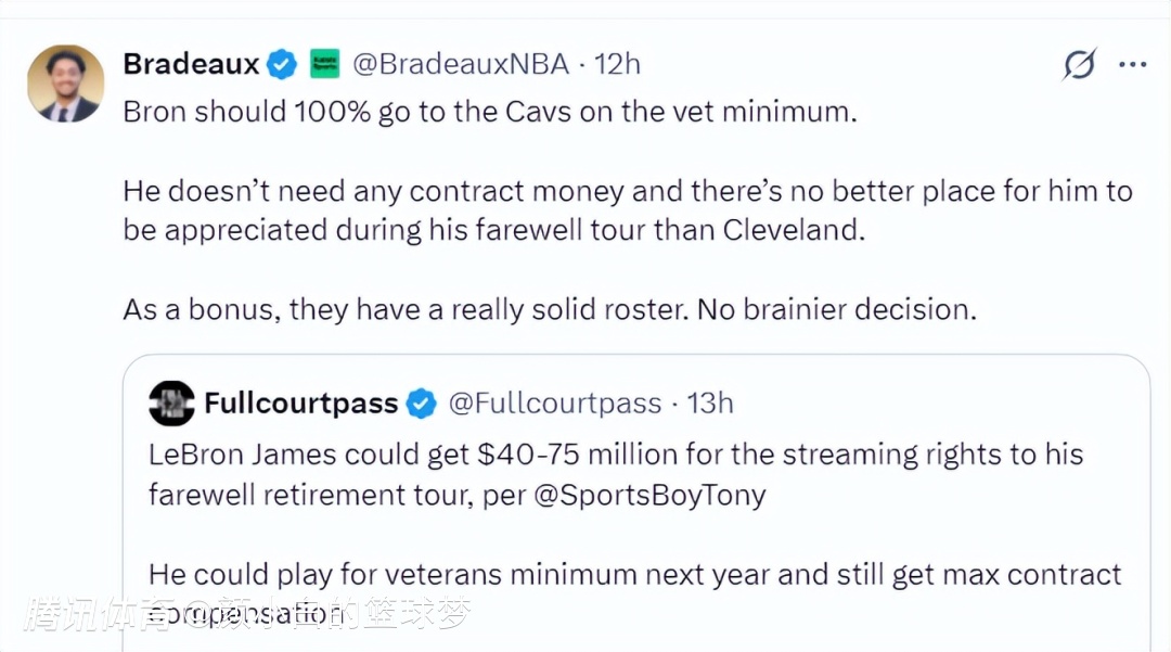 休媒Bradeaux写道:詹姆斯绝对应该以底薪加盟骑士,他不需要任何的高薪,因为他在克利夫兰举行退役巡演是众望所归,此外骑士队的阵容非常强大,他重返骑士是一个再明智不过的决定。
