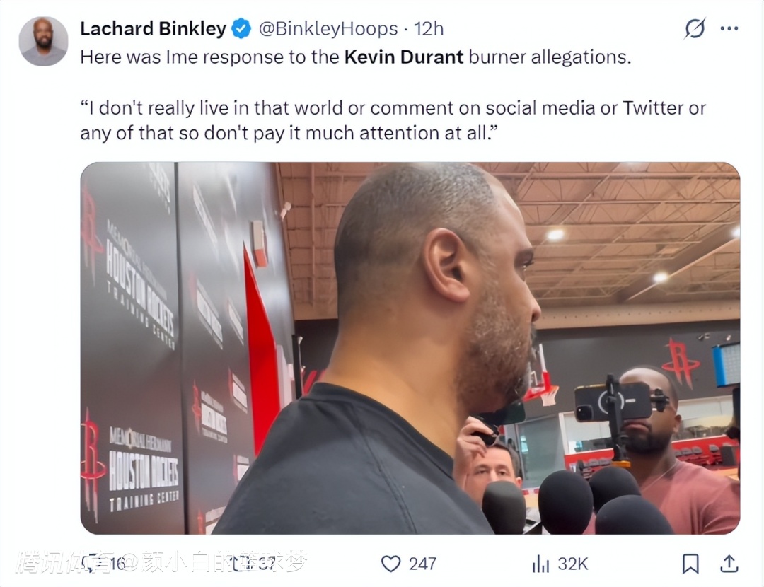 杜兰特在训练后接受采访谈到近期的疑似小号风波,他说道:我根本不想卷入推特上那些无稽之谈,我的队友们都知道怎么回事,我和火箭队整个赛季都在全力以赴。