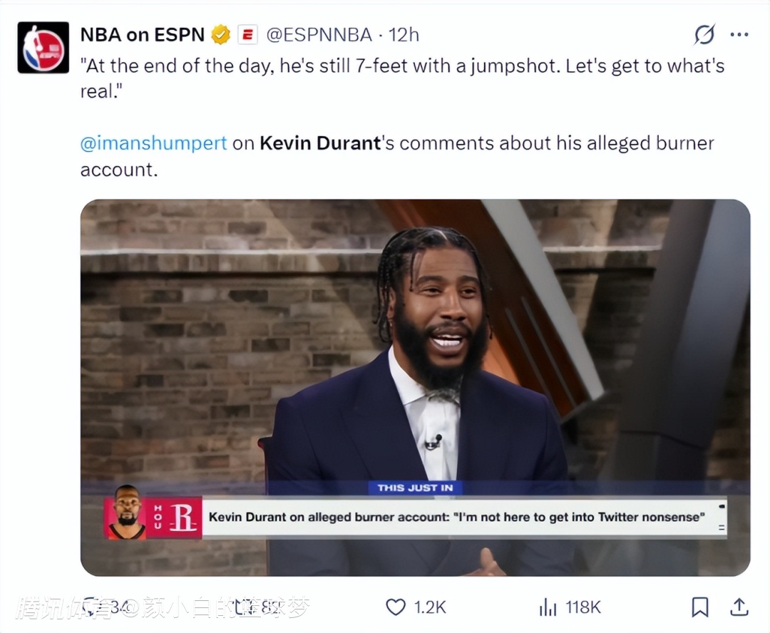 伊曼-香波特也谈到‘KD疑似小号风评’,他倡议大家回归赛场本身,他说道:归根结底,你们应该回归他的赛场表现,他依然有着7尺的身高还能投篮,来让我们看看真正的重要东西吧。