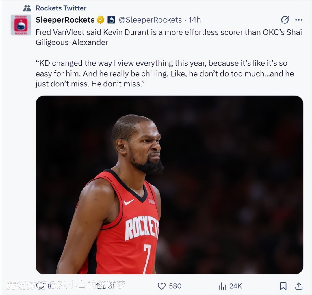 范弗利特在播客节目也这样评价杜兰特:杜兰特今年改变了我对得分的看法,因为对于他来说一切都太轻松了,他打得非常从容几乎没有过多的动作,而且感觉他一出手就会进球。