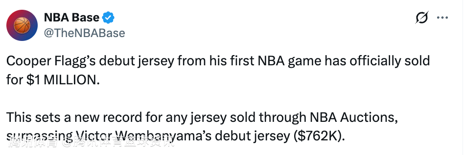 这一价格创下了NBA拍卖平台球衣成交价的新纪录,超越了文班亚马首秀球衣76.2万美元的成交价格。