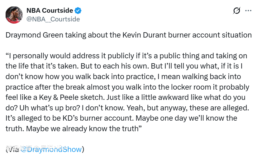 “所以如果是我,我会公开回应。但每个人处理方式不一样。不过说实话,如果真是他的小号,全明星假期后回去训练、走进更衣室,那场面估计会超级尴尬,气氛都不对了。当然,这些目前都只是传闻,只是说这个小号疑似属于杜兰特。也许有一天我们会知道真相,也许我们其实已经知道了,谁知道呢。”