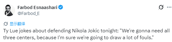 泰伦-卢直言约基奇是当今世界上最好的NBA球员,在被问及今晚如何防守约基奇时,泰伦-卢打趣道:“我们三个中锋都得用上,因为我确信我们会赔上不少犯规。”