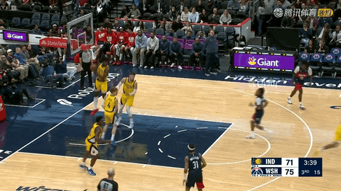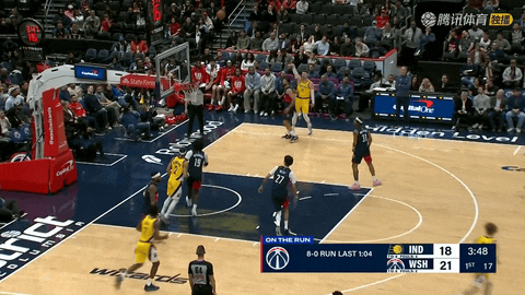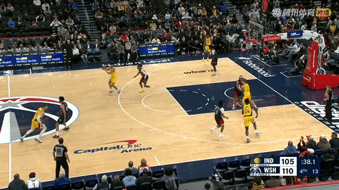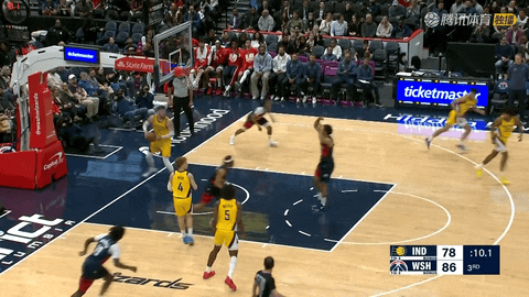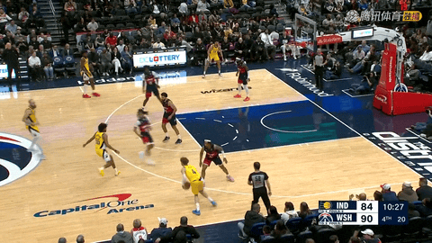 第一节还剩4分54秒到还剩3分36秒之间,奇才在1分18秒内连续5次进攻得分,将比分从18:16反超到18:23;同时从第一节还剩4分36秒到还剩3分25秒,奇才连续5次防守成功,把局面从落后2分变为领先5分,首节结束步行者24:26落后奇才。