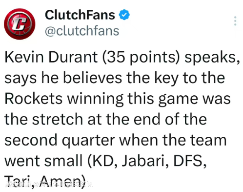 杜兰特:我们就是一起打球。第一节我们顶住了他们的猛攻,他们一上来就打得很凶。我觉得我们真正赢下比赛是在第二节末。我们改打小个阵容,成功防住几个回合,推起反击,把分差拉开到4分左右,这给了我们很大的势头。