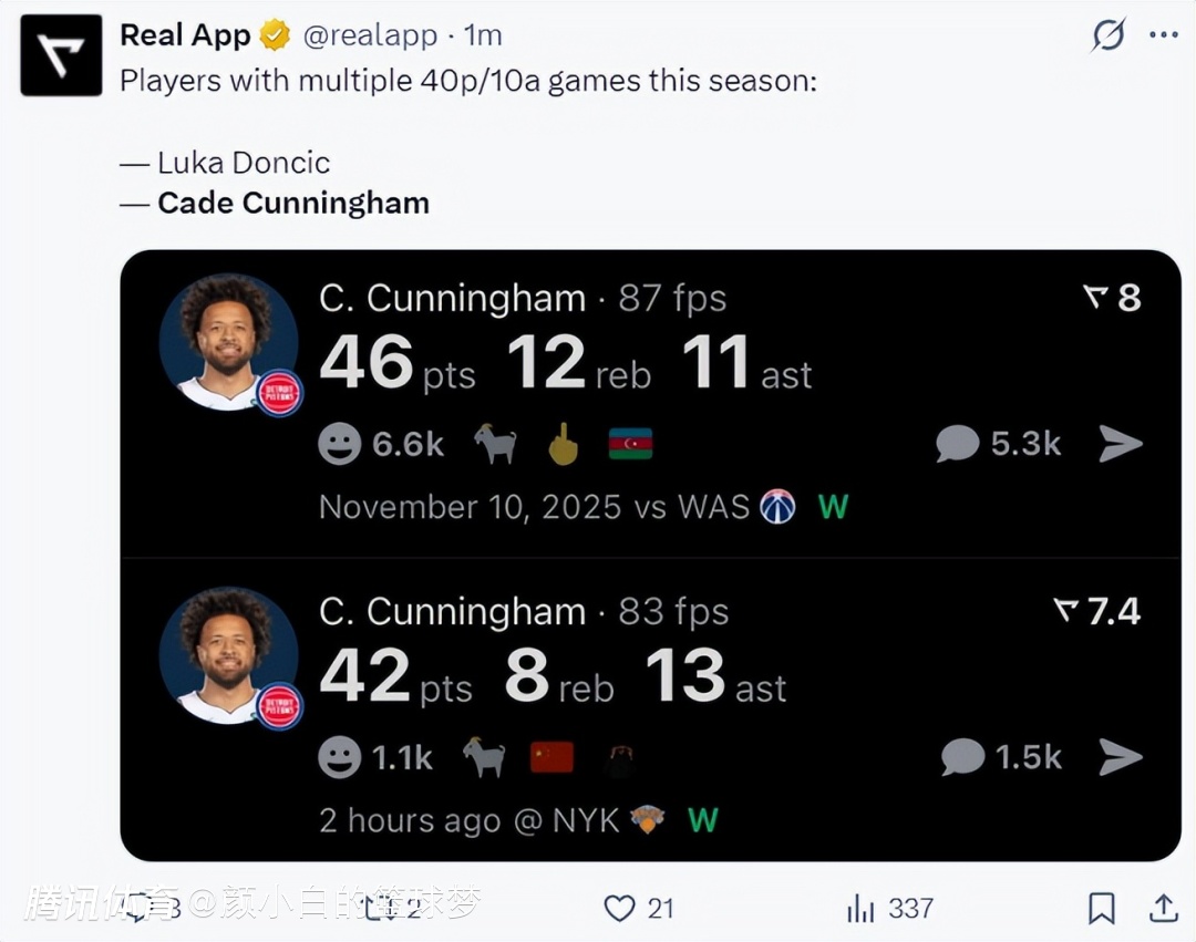 此役后坎宁安一战创造多项纪录:1.他成为活塞队史85年首位单场40+10+5+5三分的球员;