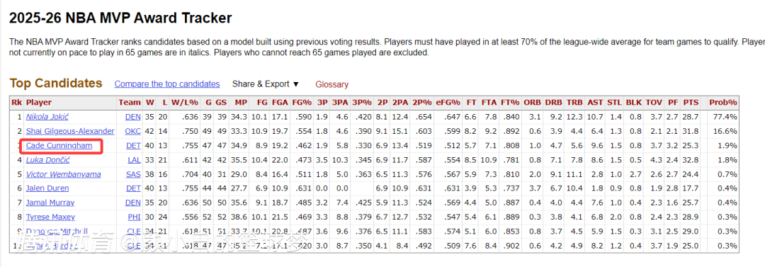 坎宁安目前的MVP概率只有1.9%排在第三,约基奇77.4%第一,亚历山大16.6%第二。