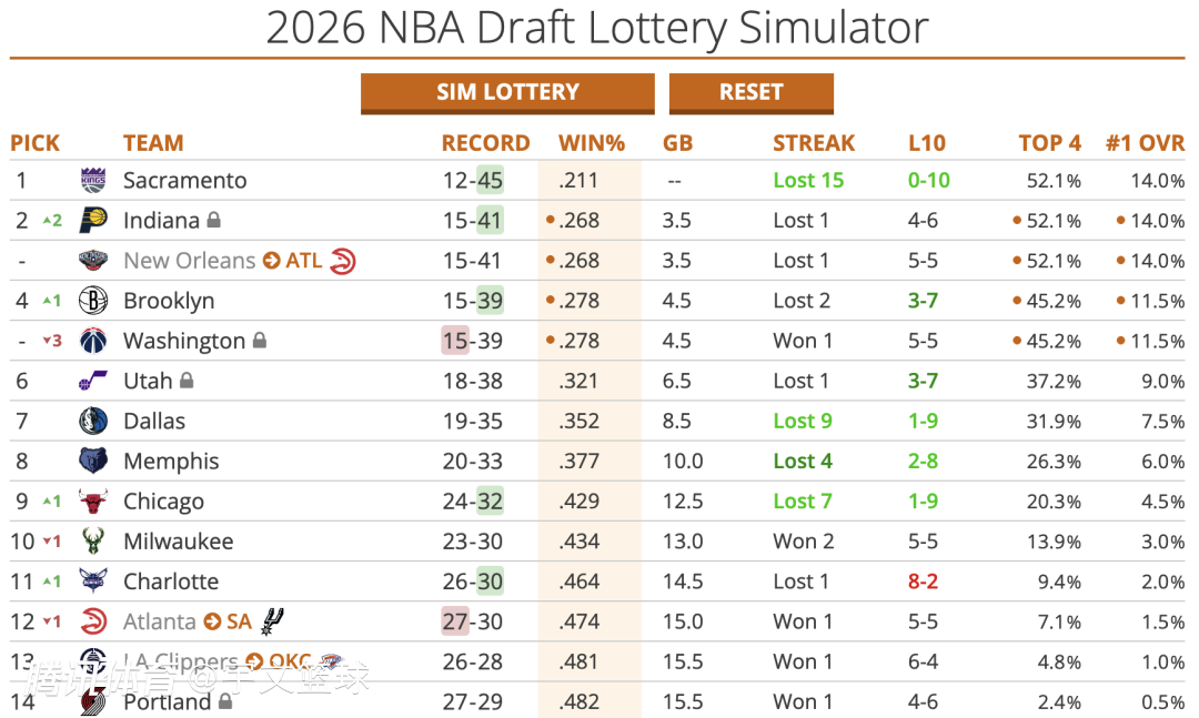 据知名数据网站Tankathon显示,国王目前争夺状元签的概率高居榜首,有14%概率抽中状元,有52.1%抽中前四。考虑今年选秀将会有皮特森、迪班萨、布泽尔等成长为巨星的潜力新星,国王摆烂似乎在意料之中,他们也在寻找可靠的重建基石。