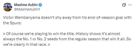 在谈到马刺队本赛季的目标时,文班亚马表示:“我们当然是在为了夺冠而战。历史表明,最终夺冠的球队大部分都是常规赛前二号种子。所以很明显,我们就在争冠行列里。”