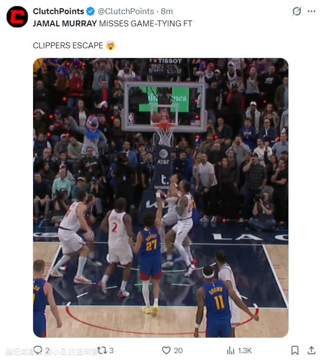 北京时间2月20日,丹佛掘金以114-115被洛杉矶快船逆转。此役掘金一度领先快船10分之多,但掘金核心后卫贾马尔-穆雷15中5+三分5中2效率极差,而且终场前0.9秒他三罚两中未能完成绝平;约基奇22中9+三分6中0+6失误,两个核心表现都不佳,但约基奇末节12分2篮板已经竭尽全力。