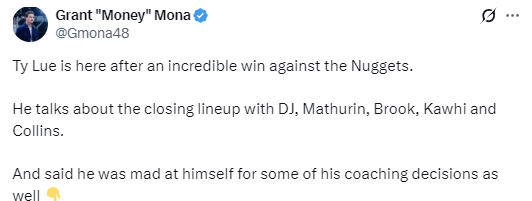在谈到最后时刻的战术犯规安排时,卢向全队道歉,他表示:“我们本来是一支会主动犯规的球队,但面对约基奇和瓦兰,我有点犹豫了,因为担心他们能完成补篮。我向全队道歉了,告诉他们我们就该坚持犯规战术,这是我的责任,我要做得更好。”