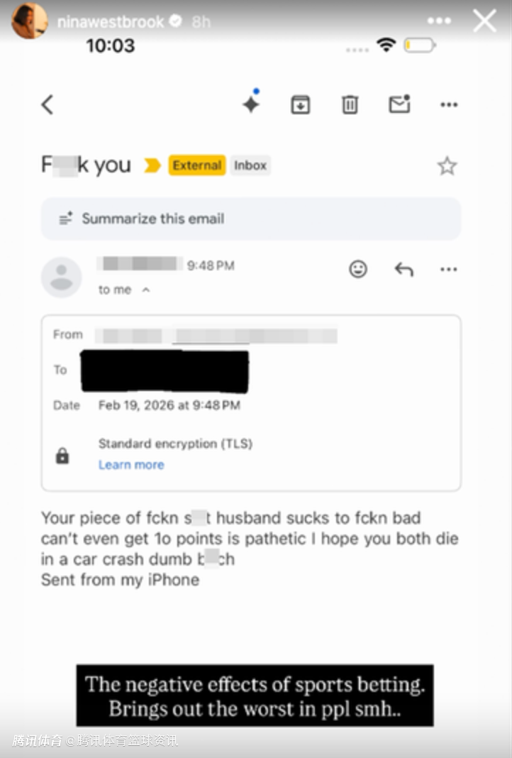 北京时间2月20日,据TMZ报道,威少的妻子妮娜收到了一封来自愤怒球迷的骇人邮件。这名球迷因不满威少在场上的表现,在邮件中辱骂她是蠢货,并诅咒他们一起死于车祸。