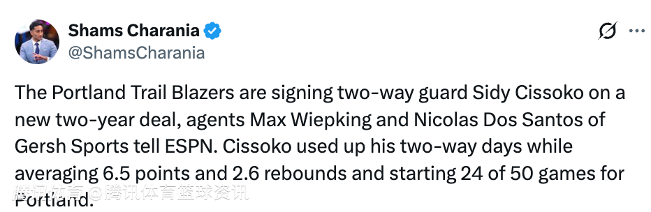 北京时间2月21日,据名记Shams报道,波特兰开拓者队将与双向合同后卫西索科签下一份为期两年的新合同。西索科已经用完了他的双向合同出场次数。