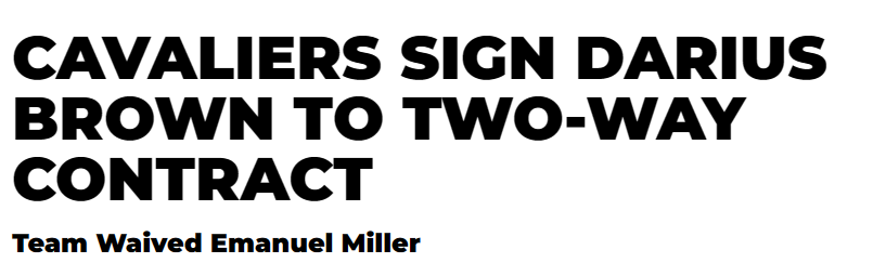 北京时间2月21日,据骑士官方消息,球队已正式与达里厄斯-布朗签下一份双向合同,并裁掉了伊曼纽尔-米勒。布朗最多可代表骑士出战15场NBA常规赛。