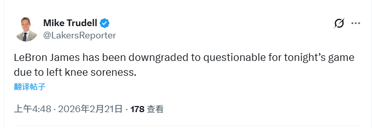 北京时间2月21日,NBA常规赛继续进行,湖人对阵快船。赛前,湖人方面更新球队本场比赛伤病报告,詹姆斯因左膝酸痛,本场比赛降级为出战成疑。