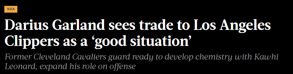 接受交易现实后,加兰对与全明星前锋莱昂纳德搭档、指导年轻球员以及获得更大进攻角色感到兴奋。“我接受这次改变。刚发生时我确实有点怀疑,但我无法拒绝这个机会——和另一位名人堂级球员(莱昂纳德)并肩作战,而且几乎99%的时间球都在我手里。”