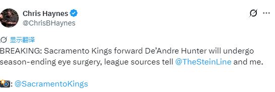 北京时间2月21日,据名记Chris Haynes以及Marc Stein报道,国王队前锋德安德烈-亨特将接受眼部手术,2025-26赛季剩余比赛全部报销。