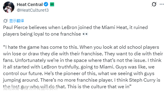 “现在联盟里已经没有所谓的‘一人一城’球员了。我觉得斯蒂芬-库里会是最后一个这样坚守的人。这就是我们现在身处的联盟文化。”