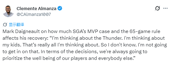 在谈到亚历山大的MVP竞争与65场出战规则对其康复的影响时,戴格诺特表示:“我考虑的是雷霆这支球队,我考虑的是我的球员,这真的就是我全部的关注点。所以我不清楚,也不会参与这些讨论。在决策上,我们永远会把球员以及所有人的健康安全放在第一位。”