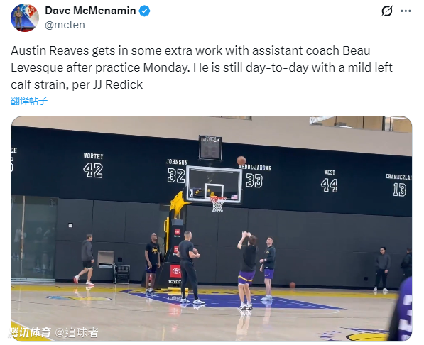 湖人随队记者Dave McMenamin报道,里夫斯在今天训练结束后与助教进行了额外训练,雷迪克透露,里夫斯目前仍处于每日观察状态,此前他因左小腿轻微拉伤已经连续缺席了3场比赛。