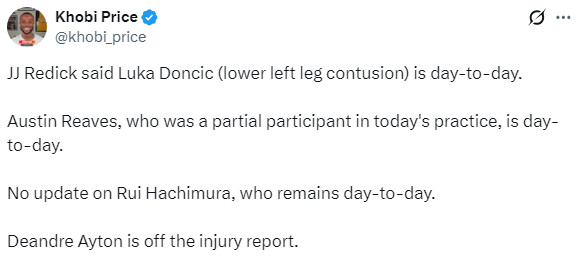 今天东契奇参加了训练,他的左小腿上绑着绑带;训练结束后,雷迪克透露,东契奇在上一场快船比赛结束后接受了评估,确认为左小腿挫伤。