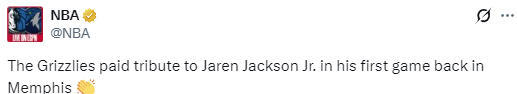 视频中回顾了小贾伦-杰克逊效力灰熊队期间的精彩表现,现场的灰熊球迷也集体为这位旧将鼓掌,甚至还有灰熊队的球迷穿着小贾伦-杰克逊的爵士队球衣。