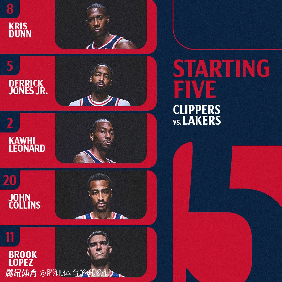 快船队的首发阵容为莱昂纳德、科林斯、大洛佩斯、小德里克-琼斯、克里斯-邓恩。这是快船队本赛季第5次使用这套首发阵容,此前取得3胜1负的战绩,加兰、比尔因伤缺阵。