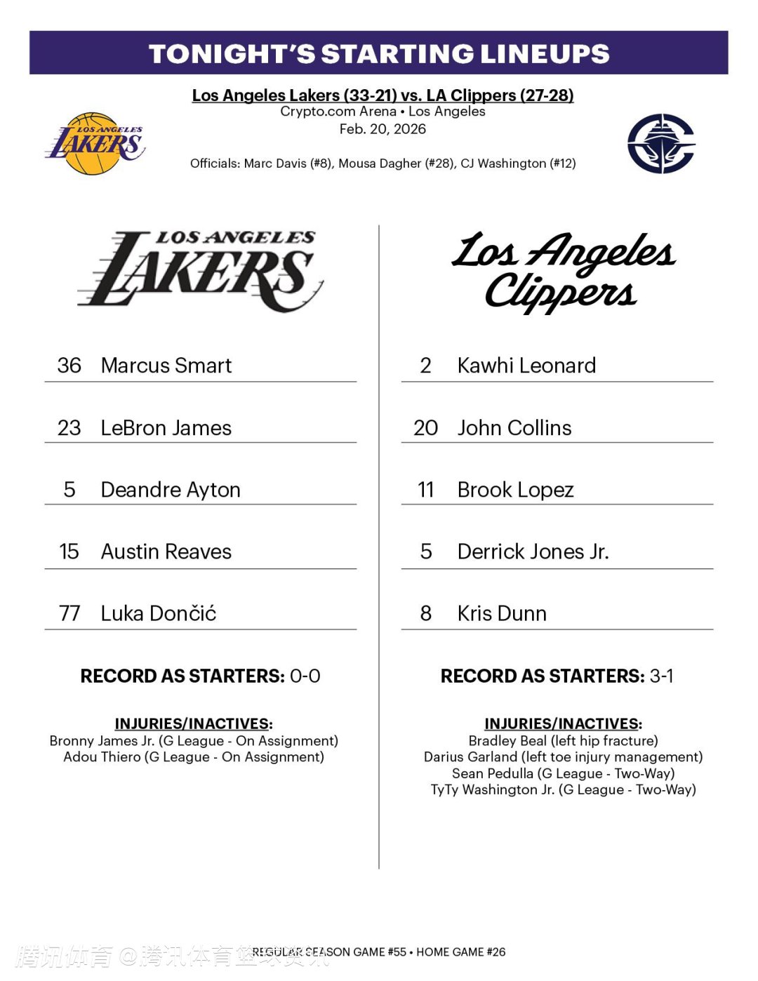 北京时间2月21日,NBA常规赛继续进行,湖人队对阵快船队。赛前,双方公布了本场比赛的首发名单。