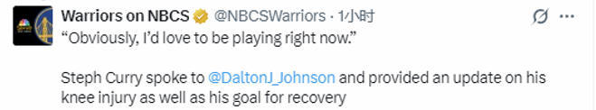 库里说道:“感觉还不错,恢复进程并没有按照我预想的那样发展,但我认为我们正朝着尽快复出的正确方向前进。我的目标是在季后赛开始前保持健康,在最关键的时刻能够出战。很显然,我现在就想上场打球。只要身体健康,你就能上场。我正朝着好的方向恢复,希望用不了多久就能回归。”