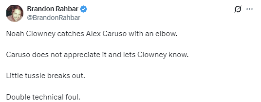 从慢动作回放来看,当时克洛尼在三分线外持球,卡鲁索上前施压试图抢断,克洛尼护球时一肘子打到了卡鲁索的脖子上,导致后者倒地。这个动作让卡鲁索很不满,他起身后立即推搡克洛尼,眼看双方冲突要扩大,两边的球员和工作人员赶紧上前,拉开了二者。