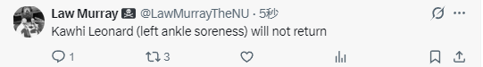 北京时间2月21日,NBA常规赛继续进行,湖人队对阵快船队。比赛进行到第四节,快船队官方宣布,莱昂纳德左脚踝酸痛退出比赛。